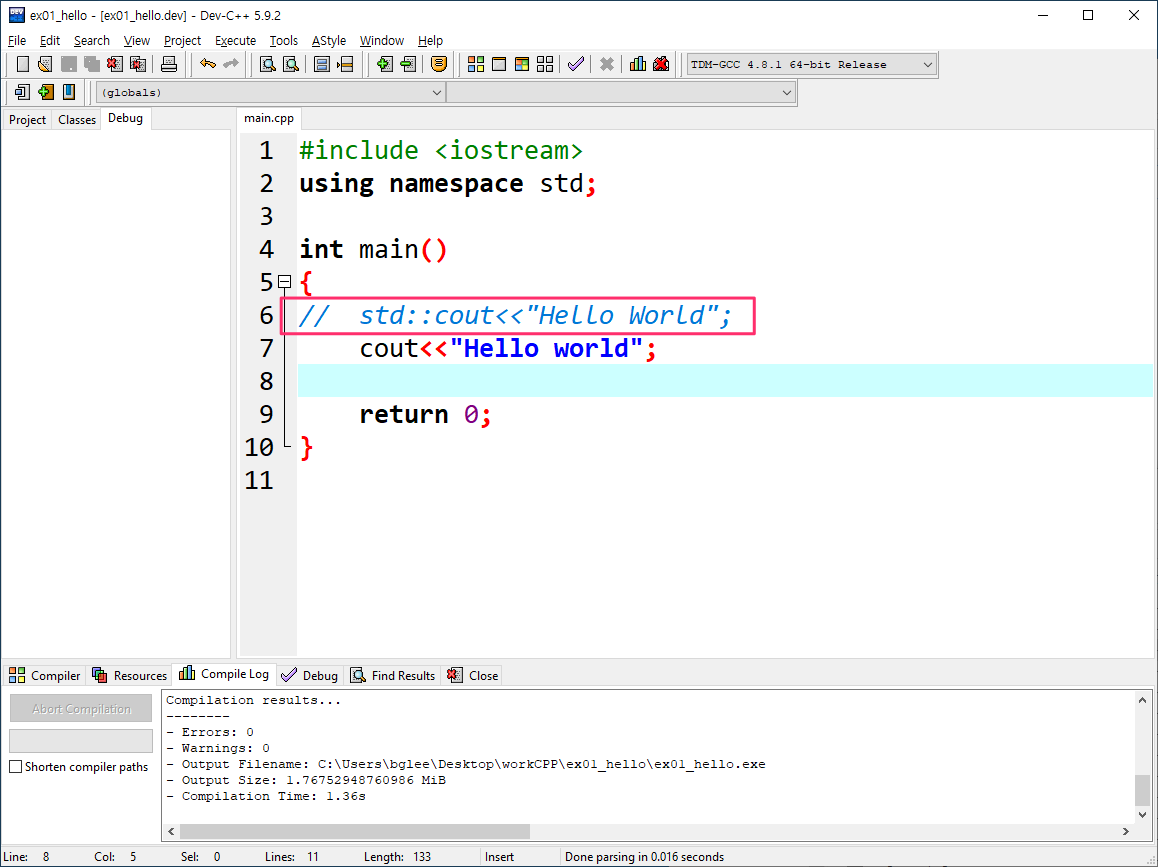 C에서는 한줄의 경우에도 /* */사용하였지만 C++의 경우 주석문으로 처리하고 싶은 경우 명령문 앞에 //를 붙임으로서 주석처리를 할 수 있다 또한 여려 줄의 경우 여러 줄 모우 앞에 //를 붙여서 주석문 처리도 가능하다
