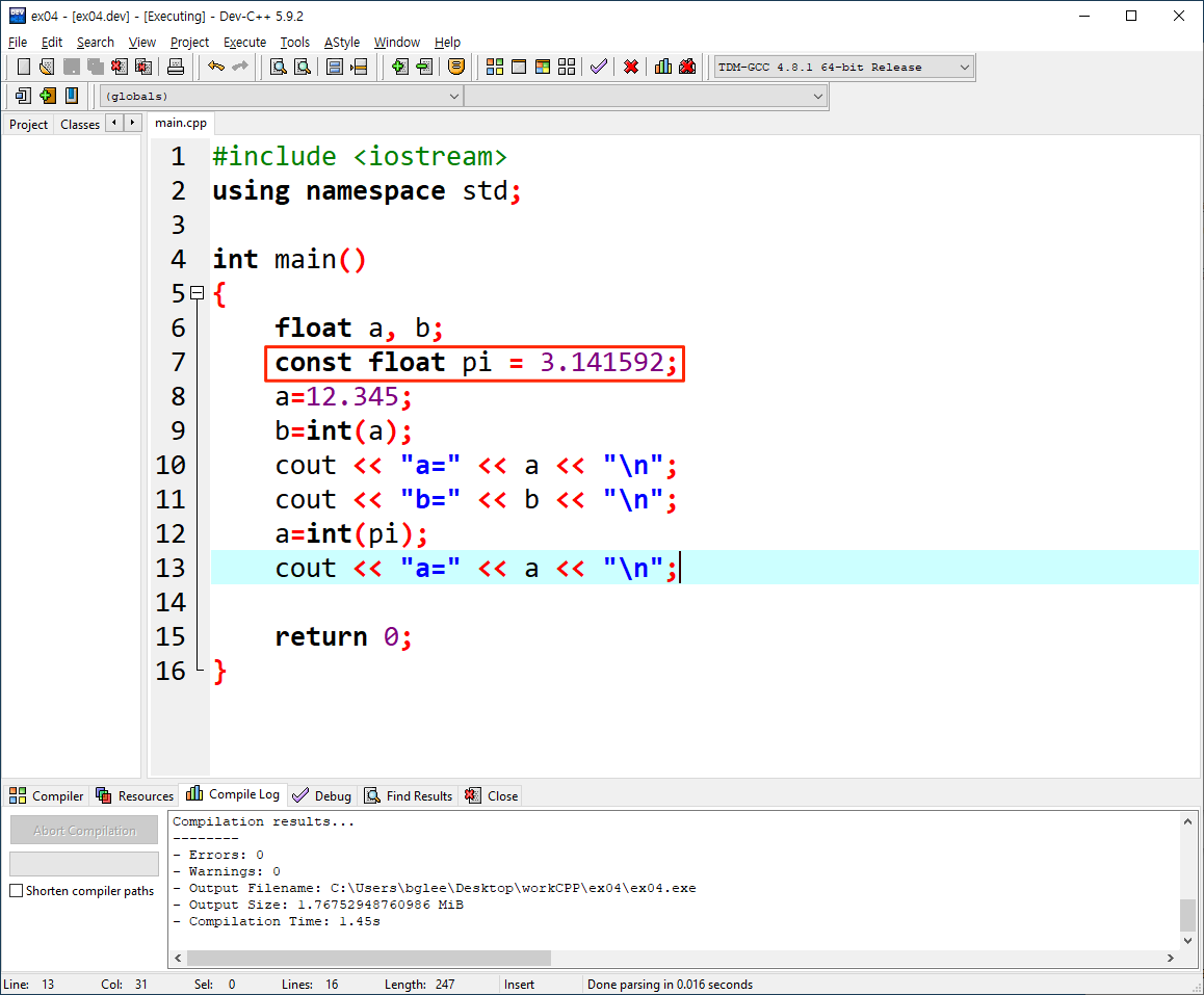 const 키워드를 사용하여 pi라는 변수를 실수형으로 선언하고 3.141592로 초기화를 하였습니다.