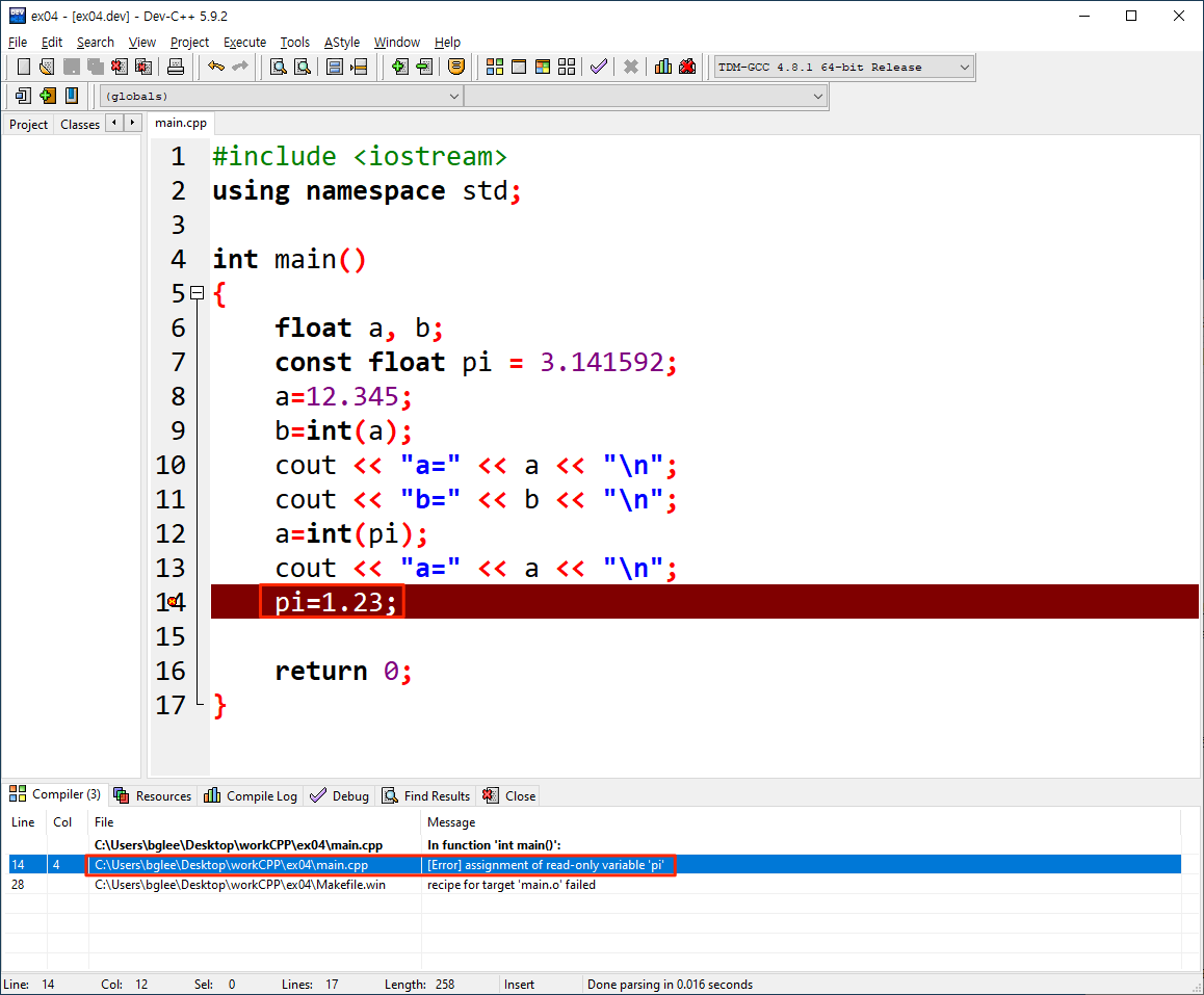 프로그램 말기에 pi를 1.23로 대입하려 할때 에러가 걸립니다. pi를 const로 선언했기 때문입니다