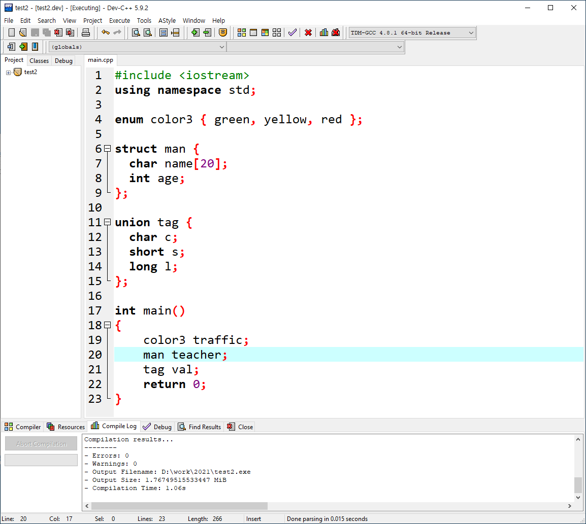 C언어에서 열거형, 구조체, 공용체 키워드 생략가능합니다. 에러 없이 컴파일 되는것을 확인 할 수 있습니다.