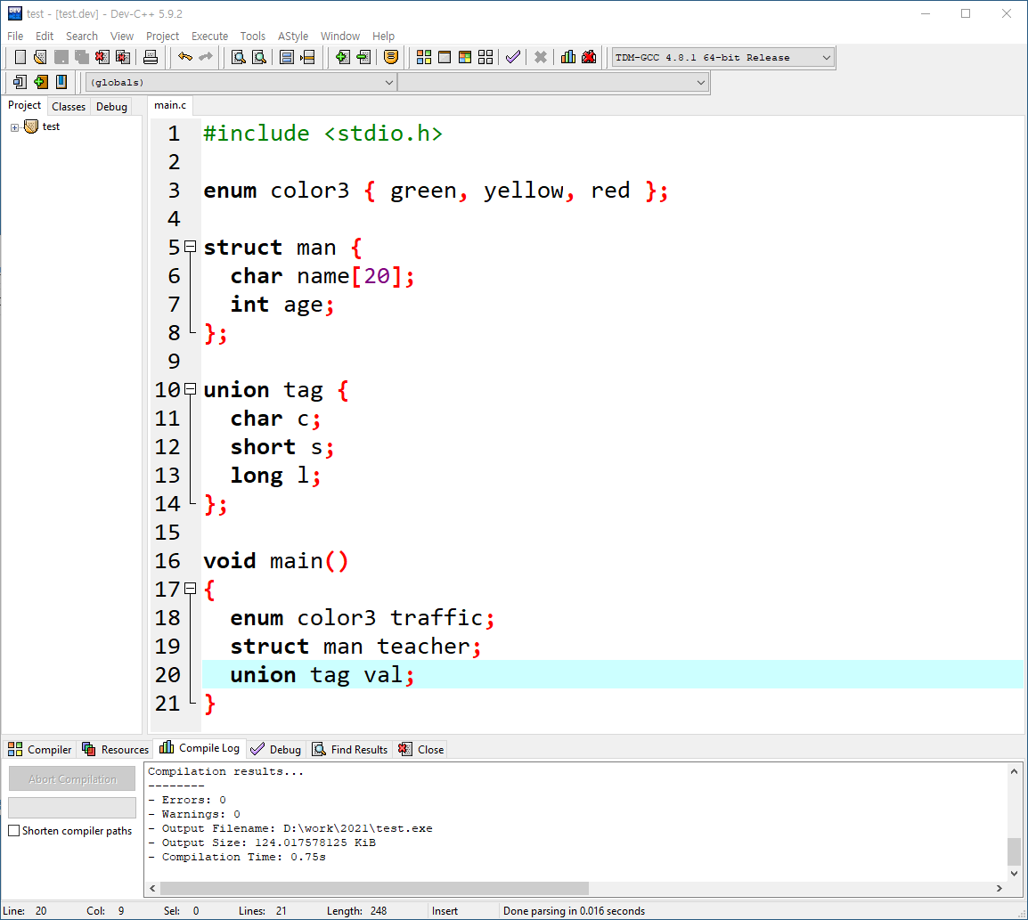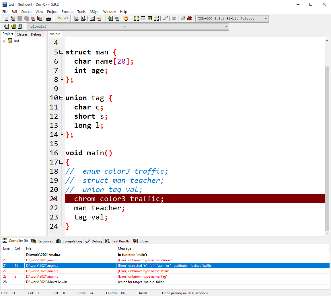 C언어에서 열거형, 구조체, 공용체 키워드 생략시 에러 발생