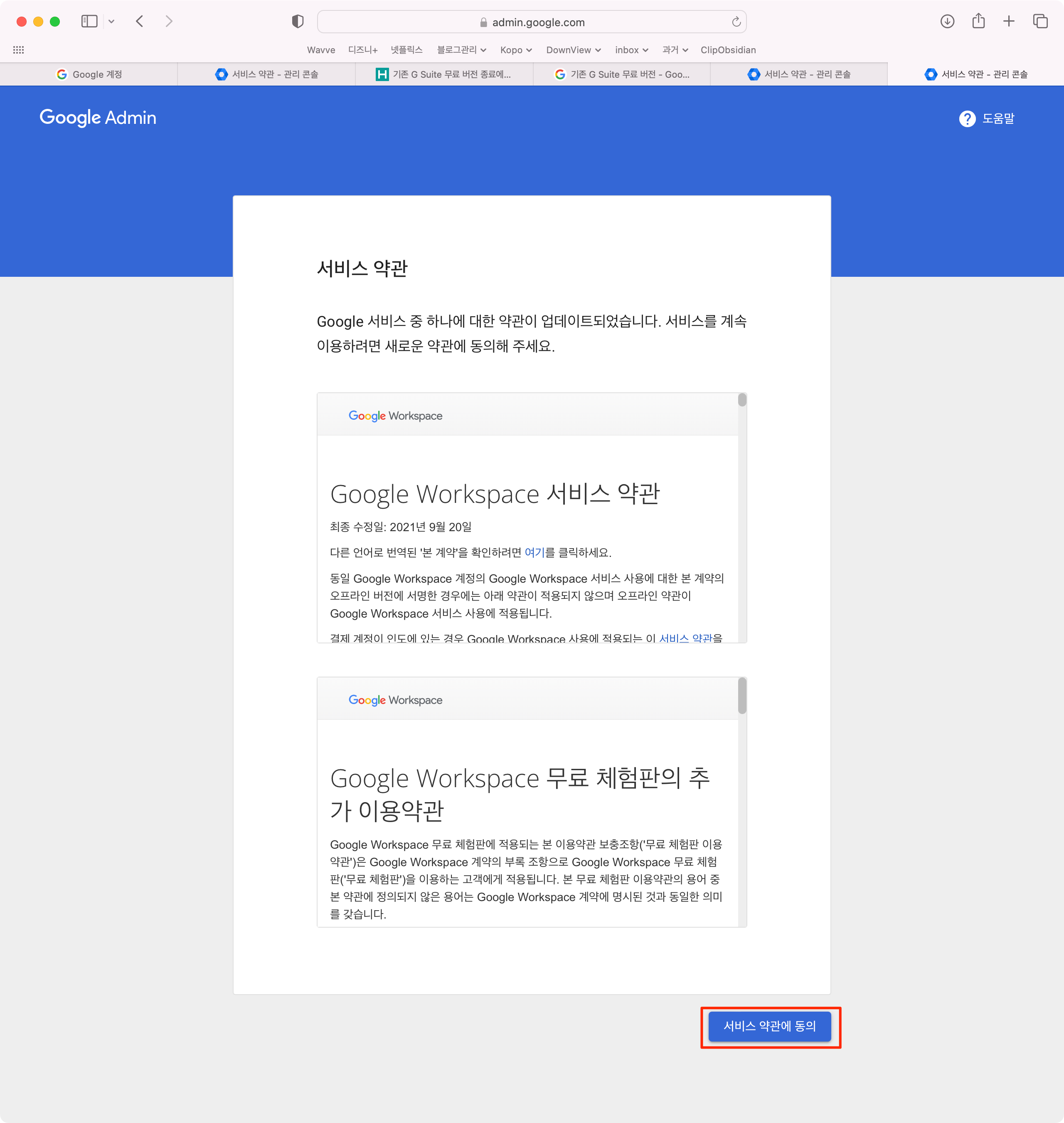 저의 경우는 처음 로그인 하여 서비스 약관 화면으로 넘어가네요. 여기서 "서비스 약관에 동의"를 클릭합니다.