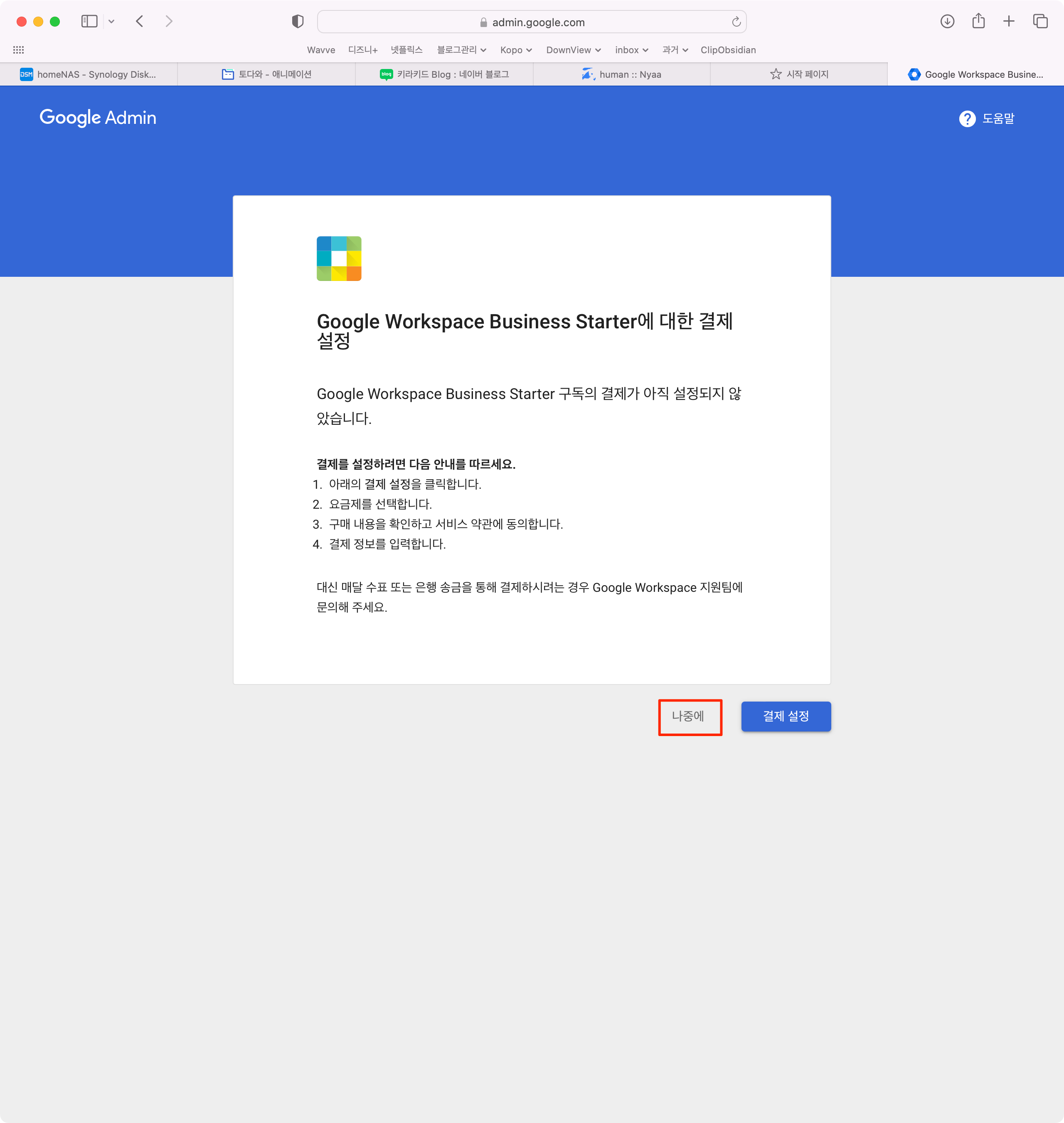 결제 화면이 나오지만 "나중에"를 클릭합니다.