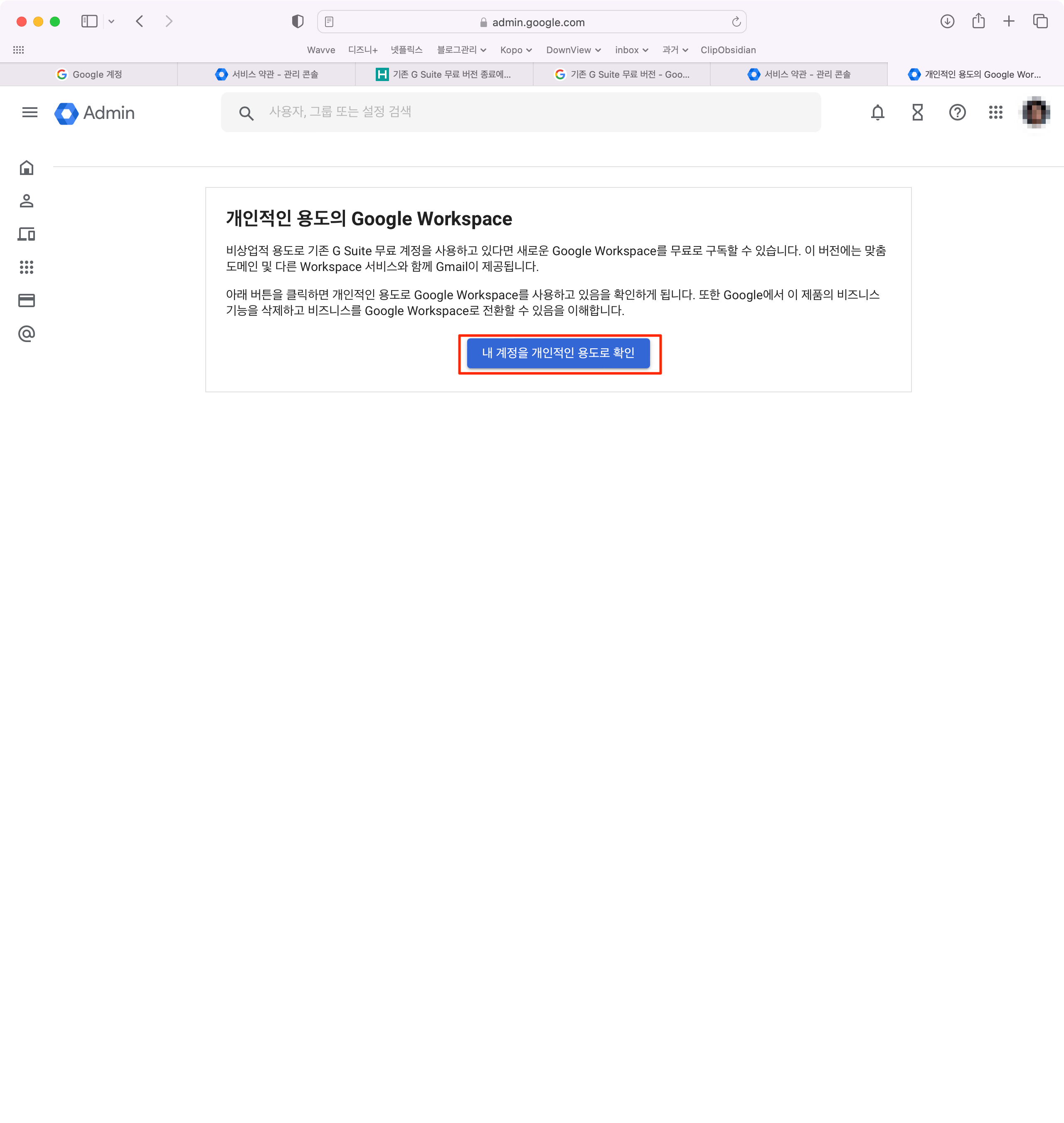링크를 타고 들어오셔셔 작업을 하셨으면 다음과 같이 개인적 용도의 Google Workspace 화면이 나올텐데요. 여기서 "내 계정을 개인적인 용도로 확인"을 클릭합니다...