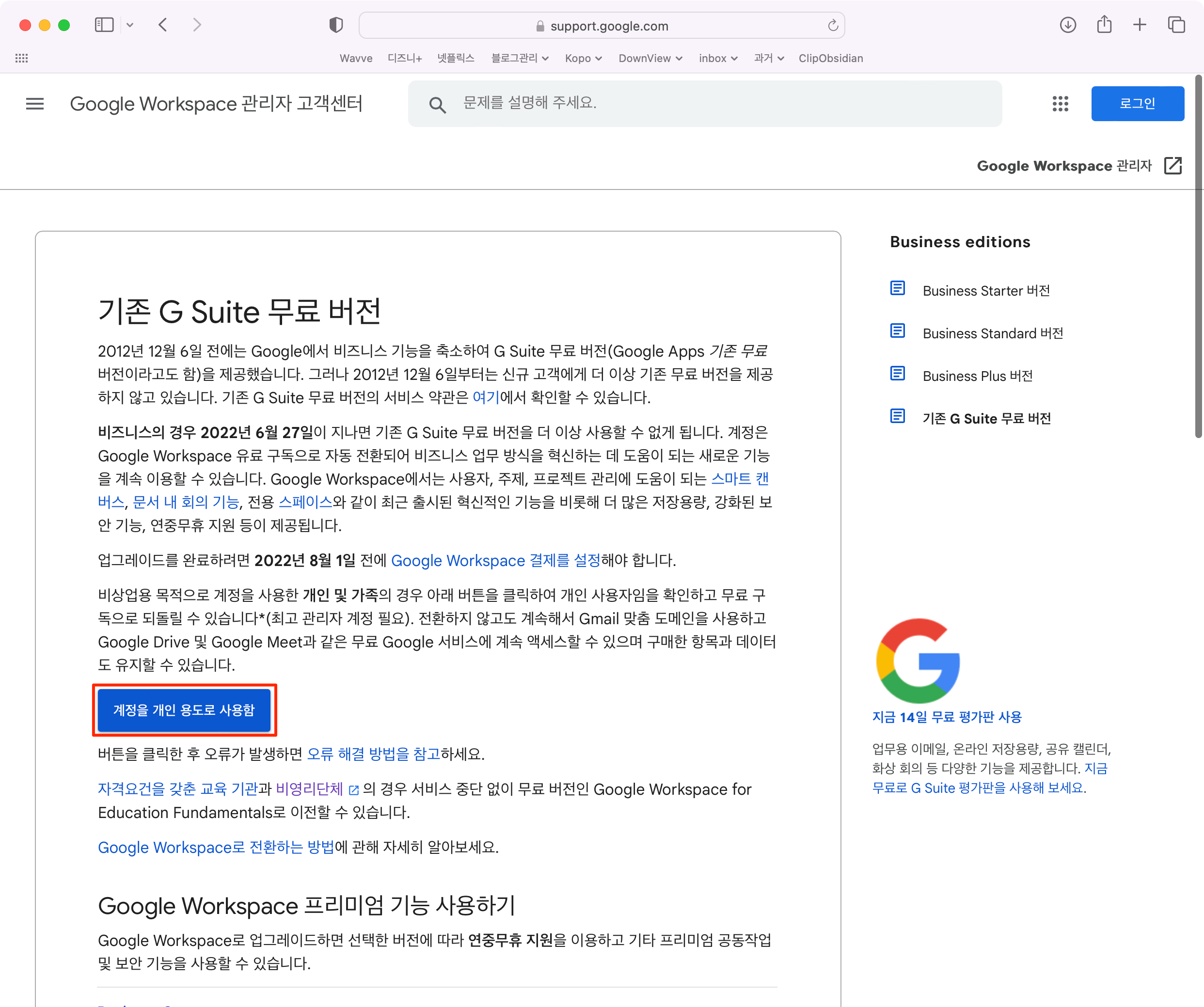 결론부터 말씀드리면 Google Workspace로 업그레이드를 하여도 개인용도로 사용하면 무료로 되돌릴수 있습니다.